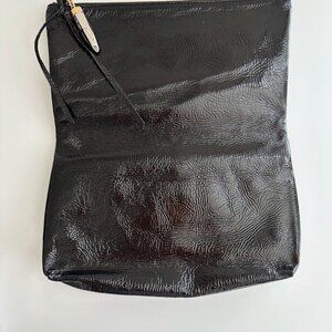 Details: black smooth and patent leather, silvertone square studs, goldtone zipper, two-tone bullet chain accent, patent leather tassles, nylon/fabric interior with side pocket. Guaranteed authentic.