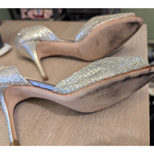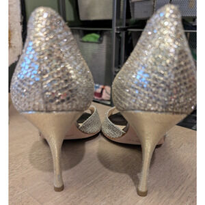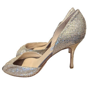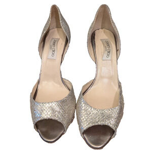 The product is a pair of Jimmy Choo D'Orsay Pumps in metallic champagne color, featuring a peep toe design and stiletto heel. These high heels are a solid pattern with glitter accents, making them perfect for occasions like weddings or parties. The shoes are made of leather with a leather lining and insole, crafted in Italy. The size of the pump is EU 41 and US 11, providing a luxurious and stylish addition to any woman's wardrobe.
