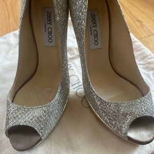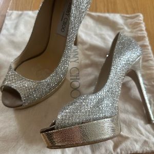 JIMMY CHOO GLITTER PEEP TOE PUMPS WITH PLATFORM SOLE. Size 8.5/38.5. Worn a handful of times. Gold sole and heel with silver glitter upper. Mixed metal very on trend! Fading in inner sole is from cushion sticker pads used for my wedding! Actual Heels r in great condition with no wear or tear on rubber. No missing glitter!