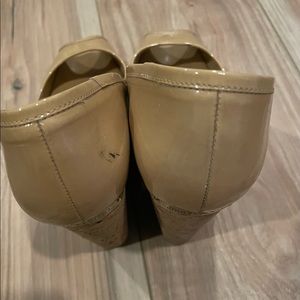 JIMMY CHOO NUDE, PATENT LEATHER, PEEP TOE WEDGES