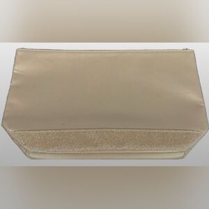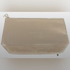 Authentic Jimmy Choo Perfum toiletry/cosmetic bag in gold! It is a medium-sized rectangular clutch bag with gold exterior and interior, glitter finish, zip closure, and gold hardware. Color may vary due to camera lighting.