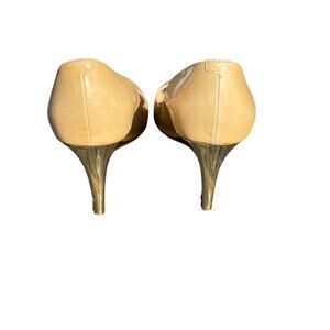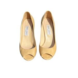 The product is a pair of Jimmy Choo patent leather chrome wedges in a women's size 9.5 (40.5). These stylish heels are made of cream-colored patent leather with a wedge design, providing both comfort and elegance. Perfect for adding a touch of luxury to any outfit, these shoes are a versatile and fashionable choice for any woman's wardrobe.