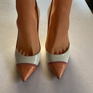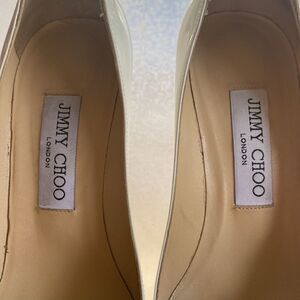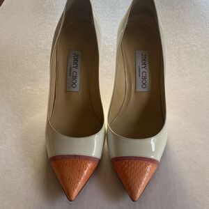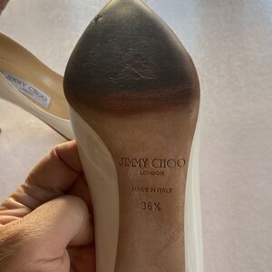JIMMY CHOO Capri Pumps Size 36 1/2 in excellent used condition. Minor discoloration at sides. Please see last photo. Price offered reflects this issue.