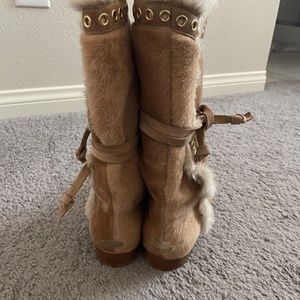 The boots are made of high-quality ponyhair material and come in beige. The boots are fur-lined and feature a lace-up closure that ensures a perfect fit. They are perfect for outdoor activities and can be worn with various outfits.
