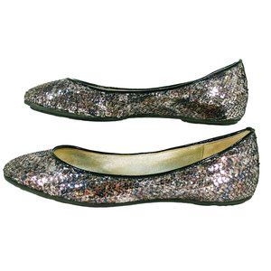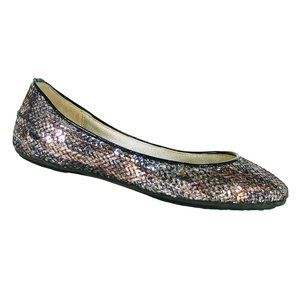 Sparkling sequin ballet flats by Jimmy Choo give you a party shoe that's wearable and really stylish. Done in silver sequins with a subtle oversized snake print, the silver color has warm tones that add depth. Patent leather piping on the opening. Gold leather lining and insole. Rubber sole. Made in Italy.