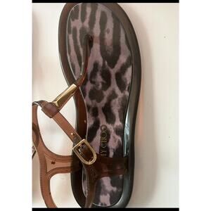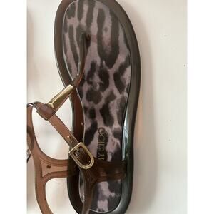 The product is a pair of Jimmy Choo thong sandals in size 9, featuring a leopard print pattern in brown color. The sandals have a flat heel under 1 inch and an adjustable buckle strap closure. They are designed specifically for women and are perfect for the spring and summer seasons. A stylish and trendy addition to any wardrobe, these sandals offer both fashion and comfort for the modern woman. Material is rubber