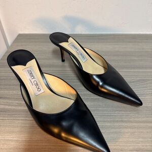 Jimmy Choo Rav 65 mules. This style features a pointed toe, a 65mm (approximately 2.6 inches) kitten heel, and is crafted from smooth black leather.