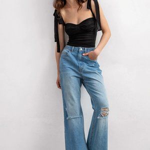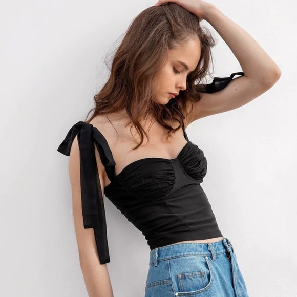 This lovely tie-neck blouse is a breezy summer dream! Features flowy shoulder tie straps for a dramatic look. Available in black, white, and light sky blue.