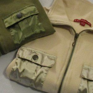 GORGEOUS full-zip tops with pleated functional satin snap pockets, and satin elbow patches; zipper on wrist, and functional zipper pocket on upper left arm. Ribbed waist, and dark bronze zipper hardware.