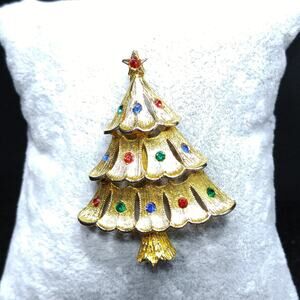*Description: This is a great Christmas Tree brooch from Jonette Jewelry Company, stamped J.J. from the 1960s. This brooch is featured in Mary Morrison's book, Christmas Jewelry, on page 49. The rhinestone lights are red, green, and blue, with a red rhinestone star on the top of the Christmas Tree. There are three separate tiers, each cut with thin, vertical, oblong slits. The settings for the stones are between the slits. The clasp is on a rivet. This would be a great brooch for the Christmas holidays and would also make a great gift.