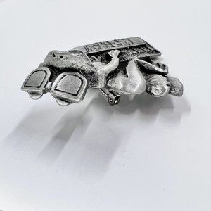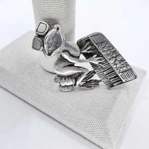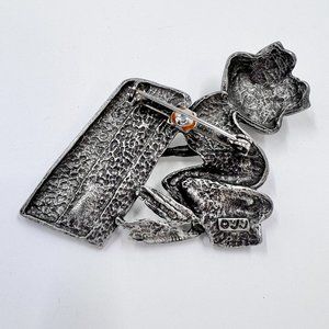 JJ Jonette - 3D Jamming Frog on Keyboard Antiqued Silver Tone Brooch Pin. Brooch is 2.75” long by 1.75” wide and is signed JJ Jonette. The glue on the backside of the brooch has browned, so please look at the pictures carefully. Brooch is previously loved and is in great condition.