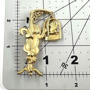 JJ Jonette Cat with Bird Cage Gold Tone Brooch Pin Vintage Jewelry Articulated