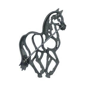 A stunning vintage piece from JJ Jonette, this galloping horse cut-out brooch is crafted from high-quality pewter. With a height of 2 inches, it is signed by the artist, making it a true collector's item.