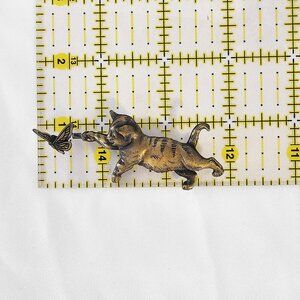 Brooch of a cat leaping to catch a butterfly. Butterfly attached by a spring and has some movement.