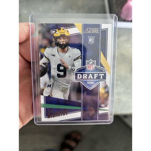 2024 Panini Score trading card featuring J.J. McCarthy of the Minnesota Vikings. This card is part of the "Draft" set, depicting the player in his college uniform. It is a standard-sized card made of card stock and is an original, not a reprint. The card is in English and is authenticated by Score, the Panini brand responsible for the manufacturing. This collectible item is a must-have for fans of football trading cards and supporters of the Minnesota Vikings.