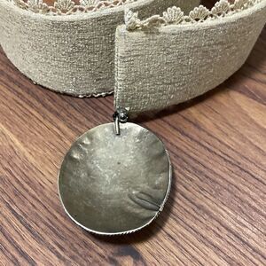 JJ Valaya women’s belt in tan fabric with silver metallic thread edged in lace. Beautiful oval metal ornament with blue & black stones hangs from belt. Hook & eye adjustable closure.