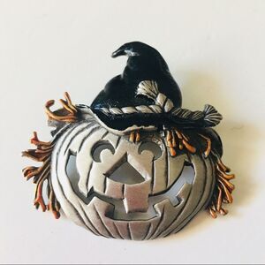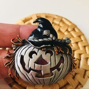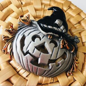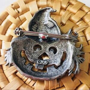 Vintage Pumpkin Witch Brooch Jack O Lantern Pin Enameling Silver Black Tone Halloween Signed JJ