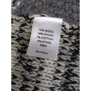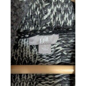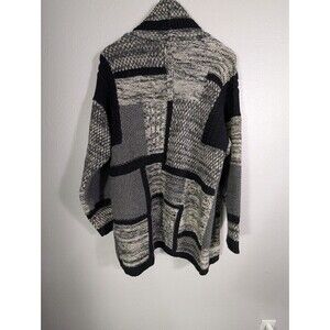 This is a J. Jill cardigan sweater coat in size L for women. It features a patchwork design in black, gray, and white colors, with a collared neckline and long sleeves. The sweater is made from a wool blend, nylon, and cotton knit fabric, giving it a bohemian and classic style. It is an open-front cardigan with a unique and stylish appearance.
