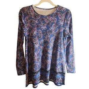 J.JILL PERFECT PIMA PURPLE PAISLEY TUNIC HI LOW SIZE MEDIUM PETITE CREW NECK