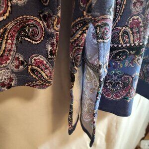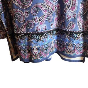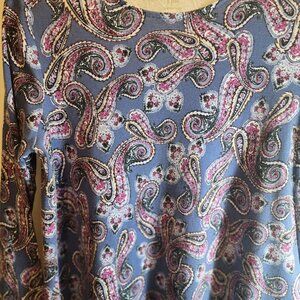 NAME: J.JILL PERFECT PIMA 100% PIMA COTTON PURPLE MULTICOLOR PAISLEY SHIRT TUNIC HI LOW SIZE MEDIUM PETITE CREW NECK VERY SOFT