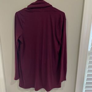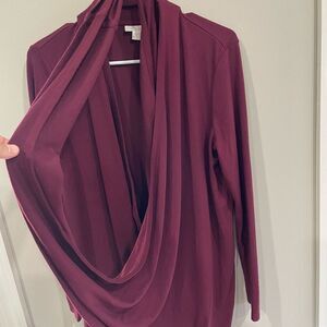 Description: Cozy, convertible cardigan from PureJill by J. Jill. Long front 'loop' twists up and over neck across the front; long sleeves, relaxed fit finishes on the hip. Modest knit in burgundy / wine red.