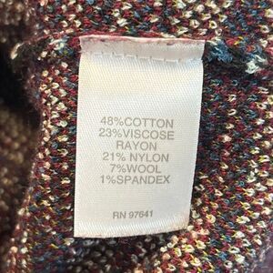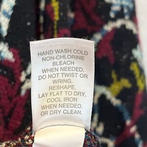 This J. Jill women’s sweater in size Large is a beautifully detailed knit piece featuring a striking black, red, and multicolor jacquard floral design. Made from a soft, blended fabric with cotton, viscose, nylon, wool, and a touch of spandex, it offers both comfort and gentle stretch. The long sleeves and crew neckline make it perfect for layering or wearing on its own during cooler seasons.