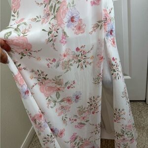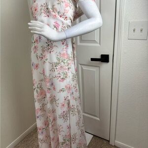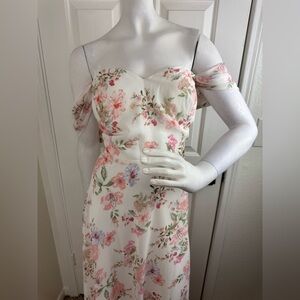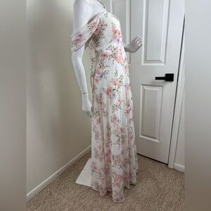 This elegant gown from JJs House features a stunning off-the-shoulder design with a sweetheart neckline, perfect for a bride or wedding guest. The cream and pink color palette, combined with a dramatic slit, adds a touch of sophistication and movement to the flowing silhouette.