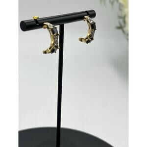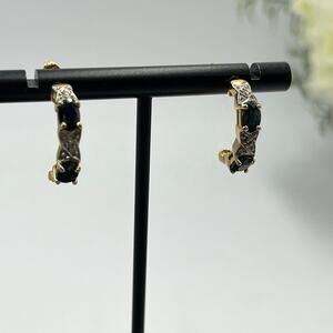 These special half hoop post earrings feature dark blue prong set topaz stones and are marked JJT 925. They are two-tone, vermeil, gold over sterling, and they measure 3/4".