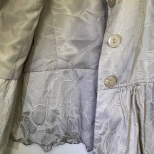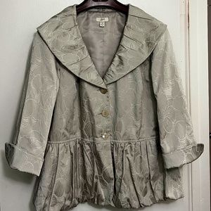 Stylish jacket made of 56%Cotton, 43% Polyester, and 1st % Spandex . Lining is 100% Polyester. Size 10 slight stretch. Lite olive color. Like new !