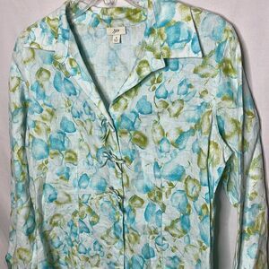 J.Jill 100% Linen Bow Button Watercolor Leaf Print Coastal Grandma Tunic Top. Size Small. Excellent condition.