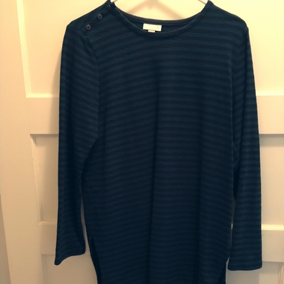 J.Jill knit tunic in dark teal and black strips. Top has a three-button detail on left shoulder and slits on the sides at the bottom for a comfortable wear. Top has been worn less than ten times and is in excellent condition.