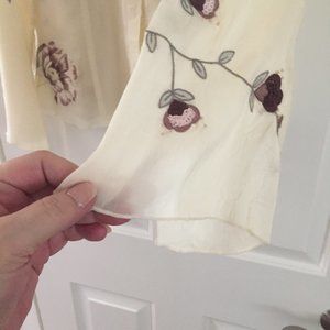 Sheer, button front ivory blouse with floral embroidery on the front, back and bell sleeves. Princess seaming front and back. Looks great with a camisole or tank underneath. Hand wash and dry flat or dry clean. Hits about mid-hip level.