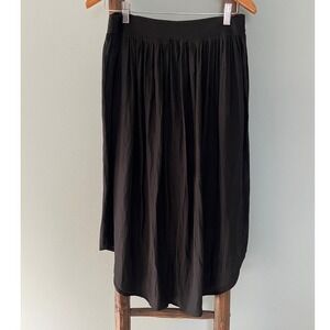 A stylish and versatile black midi skirt, perfect for adding a touch of elegance to any outfit. This J.Jill skirt features a flattering midi length with a button-front design, adding a unique and sophisticated detail. The elastic waistband ensures a comfortable and flexible fit, while the soft fabric drapes beautifully. This skirt is ideal for both casual and more dressed-up occasions, making it a versatile addition to your wardrobe. Wear it to the office with a blouse and heels, or dress it down with a t-shirt and sandals for a weekend brunch. Pre-loved and in good condition.