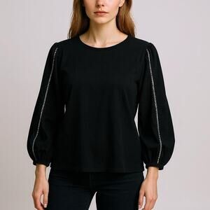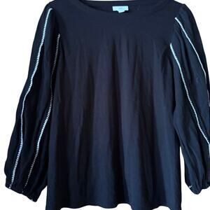 J.Jill Black Puff Sleeve Top White Stitching Bohemian Cottagecore XS