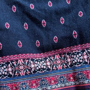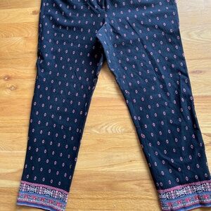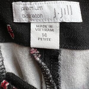 Size 14 Petite Cropped J. Jill Black with red and white diamond pattern and beautiful bottom border, in a cotton blend stretch. They are a stylish and versatile addition to any woman's wardrobe. Features a flattering flat front design with zippered, snap and button front closure. The back has two slit pockets that lie flat. These pants offer a comfortable and stretchy cotton blend material that is perfect for traveling, casual outings, or business meetings. These are ideal for the summer, fall, and spring seasons. Machine washable and dryable. Length 32 1/4', Inseam 23 1/2"