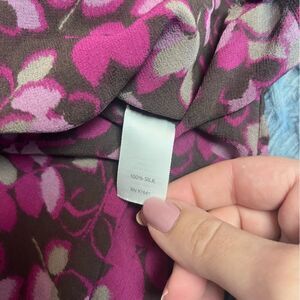 This J. Jill blouse features a relaxed fit with a beautiful floral pattern in purple and pink hues. The 3/4 sleeves add a touch of elegance, making it perfect for both casual and dressy occasions. Crafted from lightweight fabric, it offers a comfortable and stylish look.