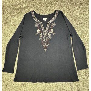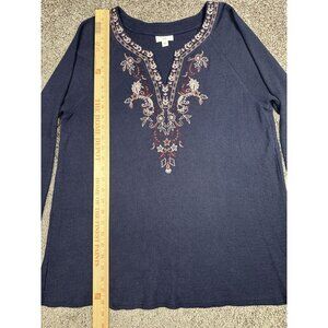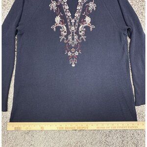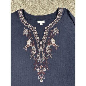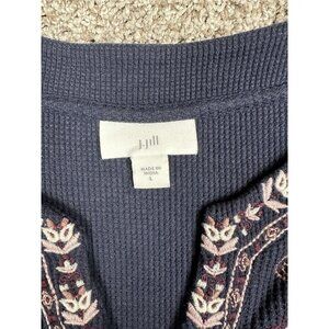 J.Jill Boho Embroidered Waffle Knit Tunic Top L Navy Pink Floral V-Neck Long