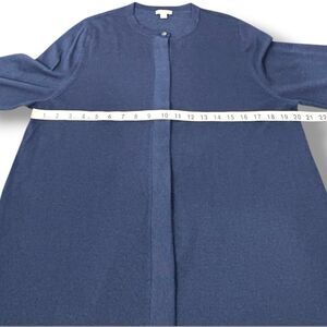 This J.Jill cardigan is a stylish and versatile addition to any woman's wardrobe. Made from a comfortable blend of polyester, cotton, and wool, this long blue sweater features a button-up front, a round neckline, and a band collar for an added touch of sophistication. The knit fabric and solid pattern make it perfect for various occasions, from casual outings to business gatherings, while the pockets add a practical element. Whether worn in the winter, fall, or spring, this cardigan is sure to become a go-to piece for any woman looking for a classic yet trendy outerwear option.