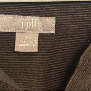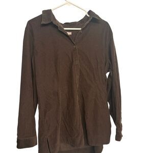 This is a preowned button front corduroy shirt by J. Jill. The shirt is a chocolate brown color with gold buttons. No holes stains or flaws.