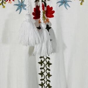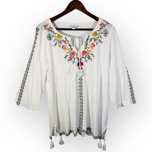 J.Jill Embroidered Floral Peasant Tunic Top White Tassel Tie 3/4 Sleeve Medium