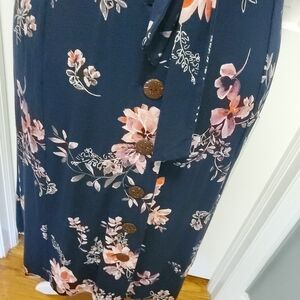 Lovely preowned soft stretchy knit pullover dress is easy and feminine, with an allover floral print that looks hand painted on a subtle slub-textured background. Soft pleats above the waist seam and a removable tie belt create waist shaping. A Multi-gore design below the waist seam creates a subtle flare and feminine sweep. Coconut shell buttons down the front of the skirt add a natural touch.