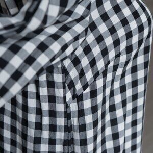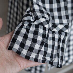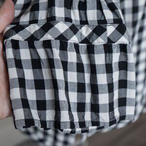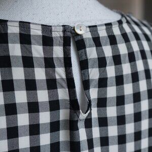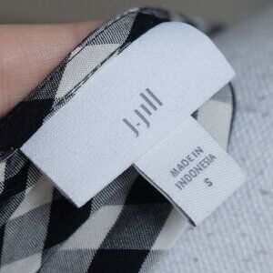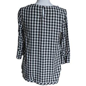 J.Jill Gingham Check Blouse Boat Neck Ruffle 3/4 Cottagecore Office Wear Blouse, size small. The J. Jill black and white gingham blouse is light weight with a crew neck and boxy fit that is perfect for summer or fall. It has neutral tones and is minimal enough to move from casual picnic attire to professional offfice wear or a dainty and feminine cottage core vibe.