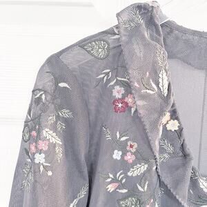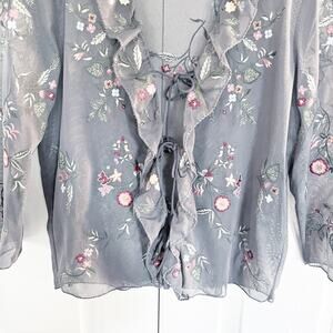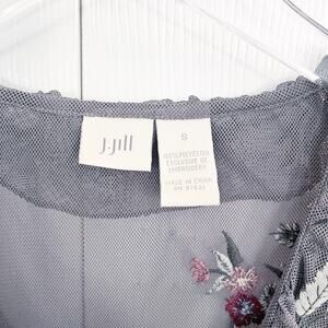 J.Jill Gray Floral Embroidered Mesh Front Tie Sheer Top