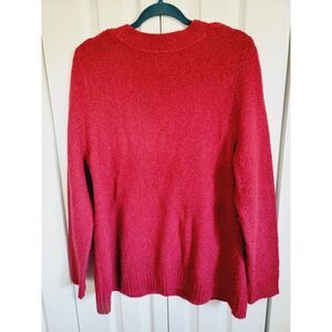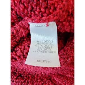 This J. Jill sweater is a size L with a classic fit, featuring a cozy cable-knit design in a speckled red color. It has a V-neckline and long balloon sleeves, creating a stylish and comfortable look perfect for travel, casual outings, or workwear. Made from a blend of cotton, acrylic, poly, spandex, alpaca, and other materials, this heavyweight sweater is super soft and ideal for the winter, fall, and spring seasons.