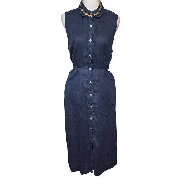 J.Jill Linen Navy Sleeveless Button-Down Midi Dress W/ Tie Belt & Pockets Size M