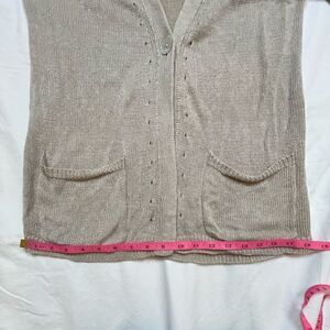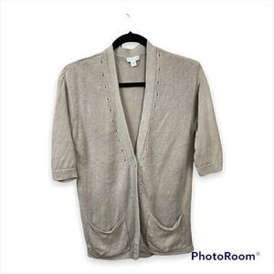 J. Jill Linen Knit Cardigan in Beige, size XS - VGUC. 100% linen knit fabric. Short sleeve with 1 button in front. Some very minor pills/snags as pictured (not very noticeable). Please see photos for approximate measurements
