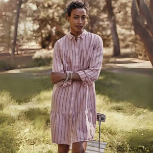 This J.Jill Love Linen dress is perfect for any occasion, from casual outings to weddings and parties. The striped pattern, collared neckline, and button closure add a touch of classic elegance, while the ruffle accents and tiered design give it a playful, yet sophisticated look. The dress is made of lightweight, woven linen fabric that is perfect for warm summer, fall, and spring days. The dress comes in a women's size medium and is machine washable for easy care. It's a shift, mini, A-line, shirt dress, and sundress style that fits any theme, from nature and art to hippie, nautical, and tropical. The dress is perfect for travel, workwear, business, holy communion, and more. Get ready to turn heads with this beautiful dress from J.Jill.