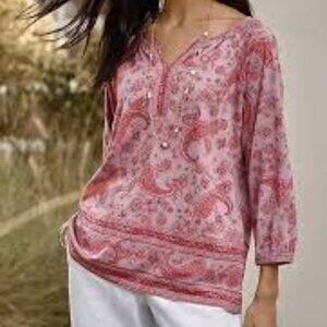 J.Jill Pure Jill Women's Medium Split Neck Border-Printed Top Pink Purple Modal Stretch Jersey Knit Loose Fit Paisley Print