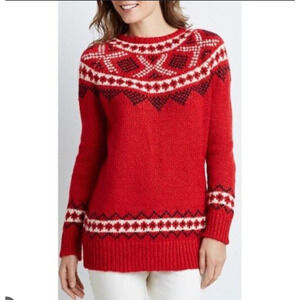 Beautiful J.Jill red Fair Isle sweater in a cozy wool blend, perfect for the holiday and winter season. This pullover features a classic Nordic pattern in red, cream, and black tones with a relaxed, slightly oversized fit that flatters and keeps you warm. Crafted from a soft yet durable wool-blend knit — ideal for layering or wearing on its own.