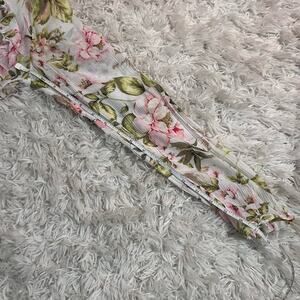 This J.Jill floral ruffle detail light weight blouse has a button front and is a size S. It has key hole button cuffs on the sleeves. This top has been previously owned and is in good used condition